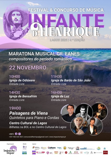 Às 19h00, no Centro Cultural de Lagos, para finalizar a maratona, terá lugar o espetáculo “Paisagens de Viena - Quintetos para Piano e Cordas”, com Mikhail Shumov (violoncelo), João Cunha (violino), Bruno Martins (contrabaixo), Pedro Sá (violeta) e João Rosa (piano).