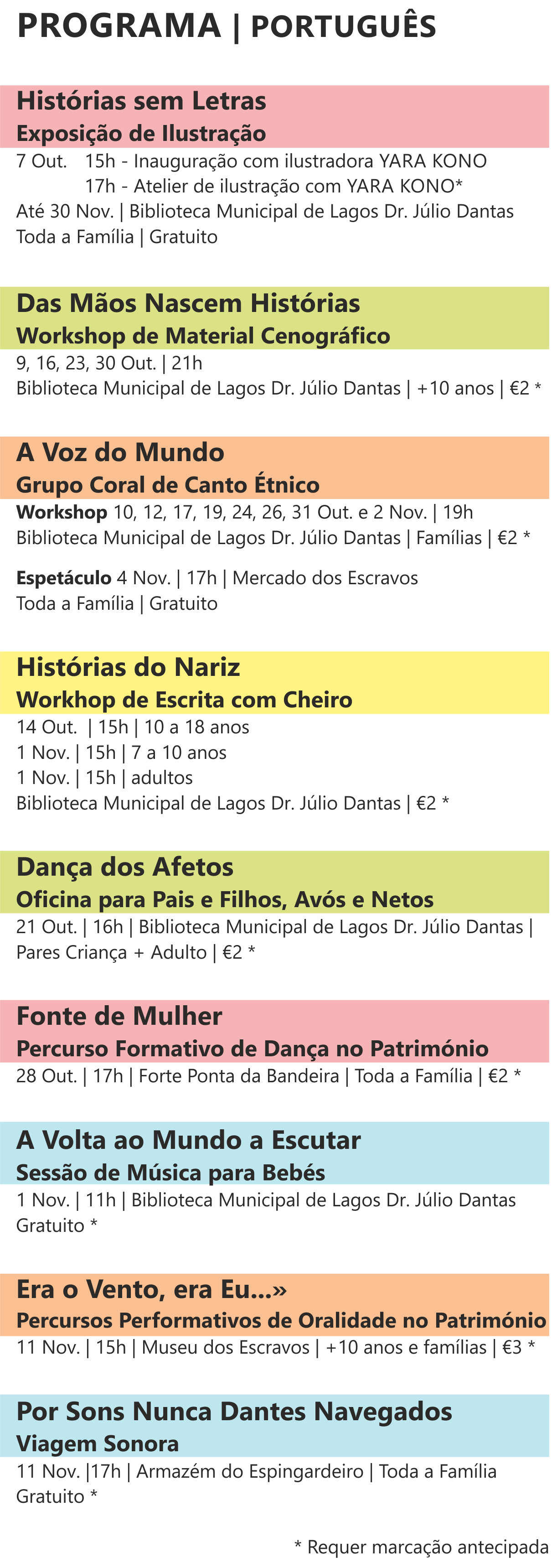 As iniciativas integradas nesta Festa vão decorrer de 7 de outubro a 11 de novembro na Biblioteca Municipal de Lagos Júlio Dantas e nos seguintes espaços museológicos de Lagos: Armazém do Espingardeiro, Forte Ponta da Bandeira, Mercado dos Escravos e Centro de Documentação do Museu Municipal Dr. José Formosinho.